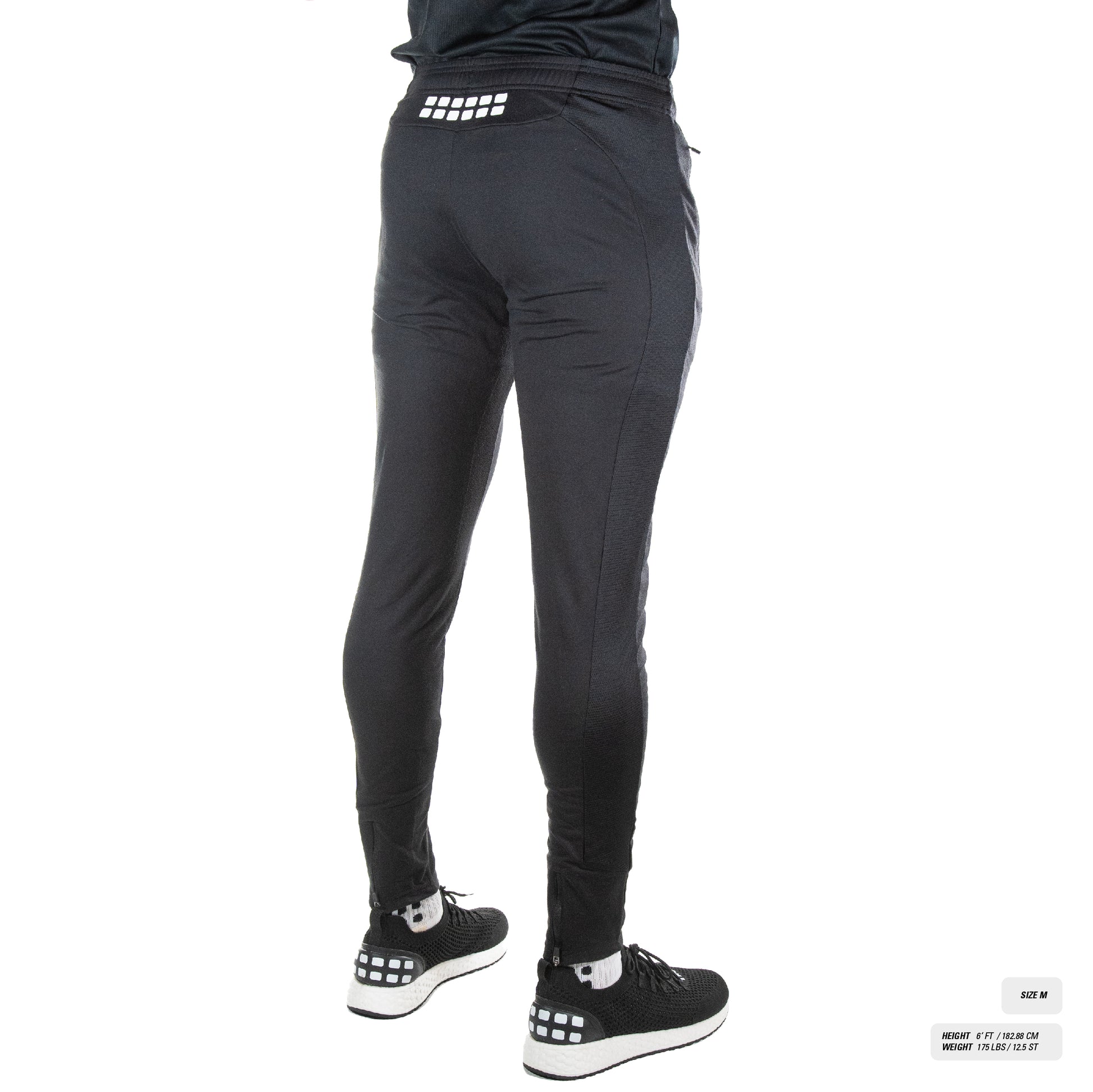 Tapered shape with straight cuff includes a gripper technology waistband for minimal movement and a secure fit.
